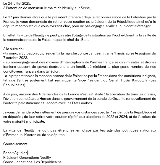 Le 24 juillet 2025, À l’attention de monsieur le maire de Neuilly-sur-Seine, Le 17 juin dernier alors que le président préparait déjà la reconnaissance de la Palestine par la France, je vous demandais de retirer votre soutien au président de la République ainsi qu’à la député macroniste que vous avez fait élire, pour ne pasLire la suite « Annonce d’Emmanuel Macron de la reconnaissance de l’État de Palestine par la France. »