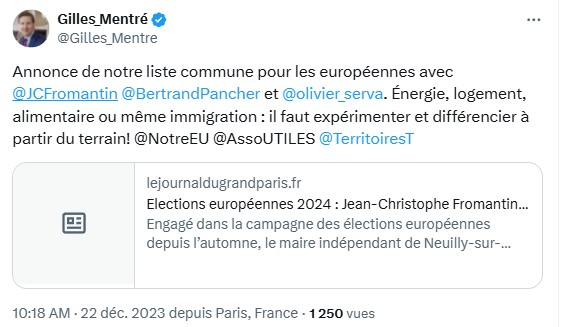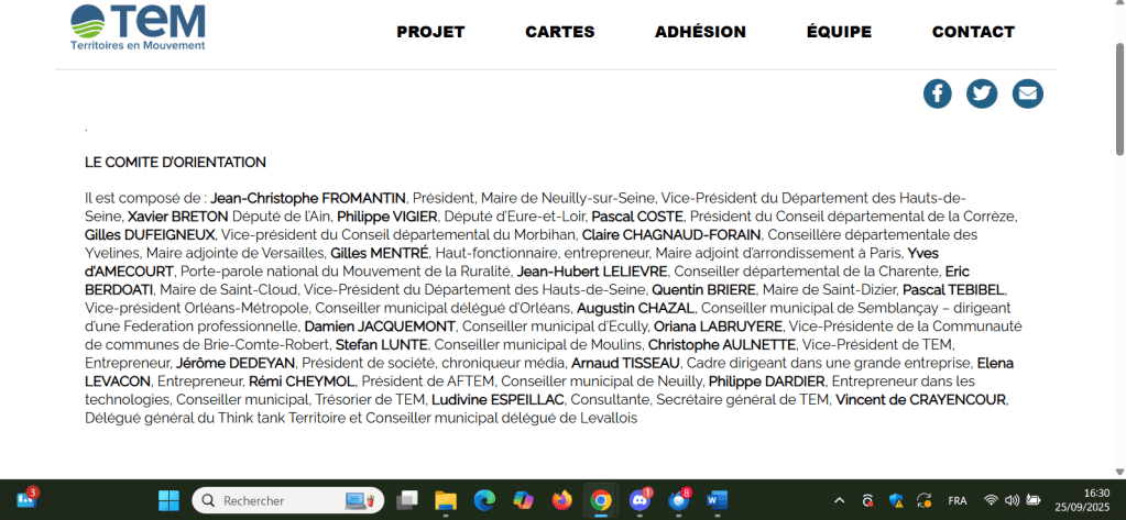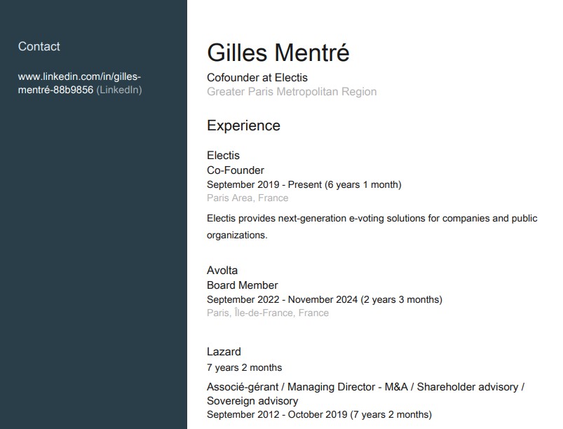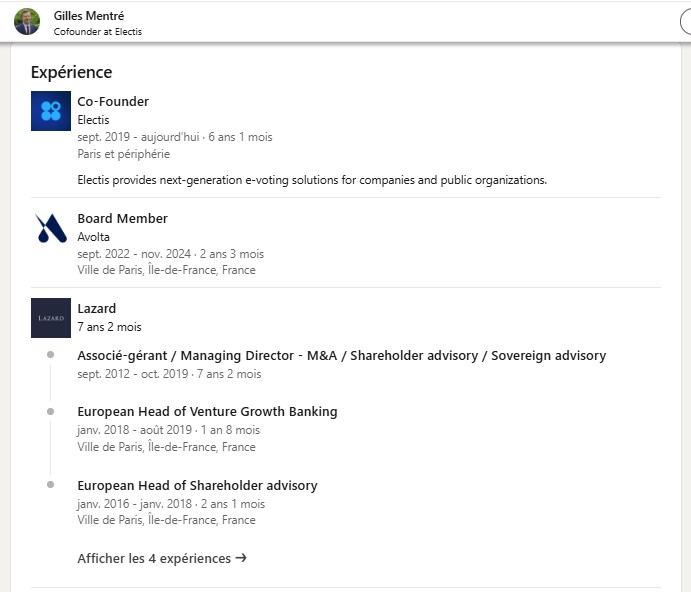 Cette société, Electis, dont M. Gilles Mentré, maire-adjoint du 16ème arrondissement de Paris par ailleurs, est cofondateur, et ayant exercé les fonctions précédemment de président par le biais de sa holding CHAILLOT ADVISORY semble entretenir d’étroits liens avec vous, liens visibles à travers votre « aventure commune » menée en perspective des élections européennes de 2024, élections pour lesquelles vous l’aviez choisi comme candidat de votre liste avant d’abandonner en cours de route. Il est aussi membre du comité d’orientation de votre micro-parti depuis 2017 (https://www.territoiresenmouvement.com/a-propos/), assurant de façon certaine votre proximité durable.