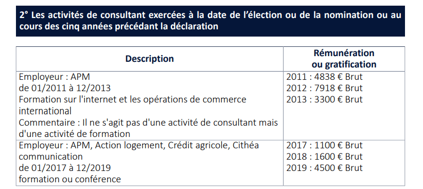 La déclaration par le maire à la HATVP (Haute Autorité pour la Transparence de la Vie Publique) de ses revenus personnels, résultant de contrats entre lui et des prestataires de la mairie, également bénéficiaires des achats publics de la Mairie de Neuilly. Cliquez ici pour lire la déclaration du maire à la HATVP.