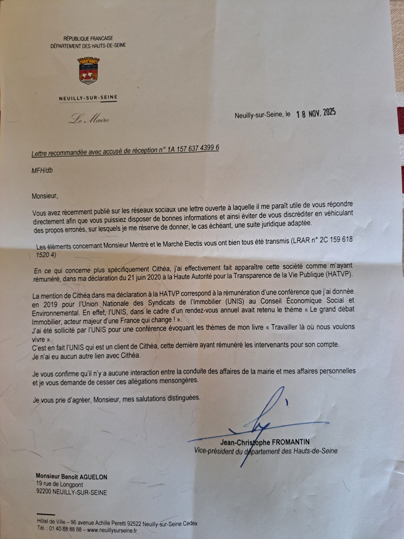 Courrier du maire de Neuilly à Benoit Aguelon, daté du 18 novembre 2025.