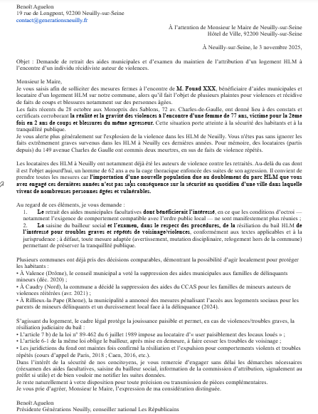 Courrier de Benoit Aguelon au maire de Neuilly le 9 novembre 2025