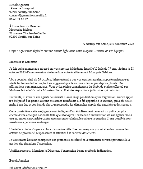 Je fais suite au message adressé par vos services à Madame Isabelle V, âgée de 77 ans, victime le 28 octobre 2025 d’une agression violente dans votre établissement Monoprix Sablons.
